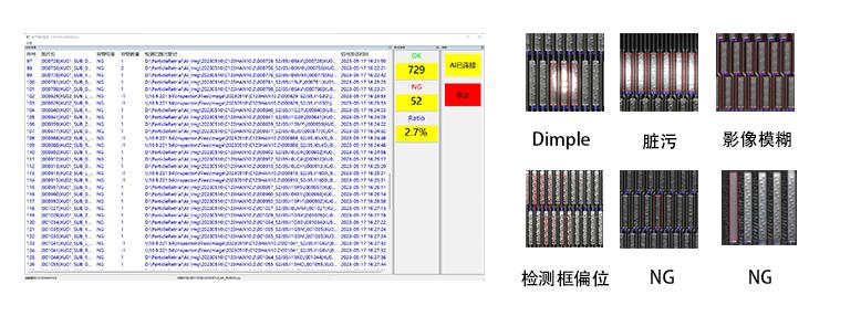 For products with particle count less than the set threshold, perform secondary judgment, filter out misjudgments caused by Dimple, dirt, image blur, deviation, etc., and accurately detect genuine NG products. |